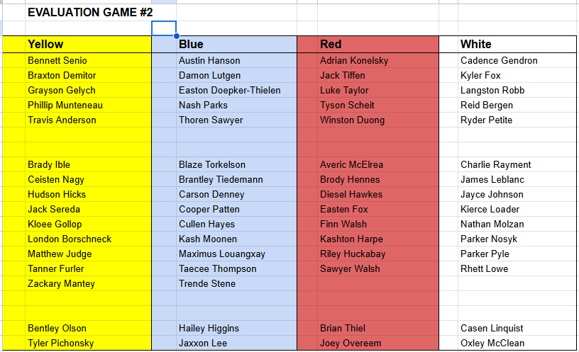 Updated rosters for tomorrow's evaluation games are posted below. Please double-check the NEW rosters to confirm which team your player has been placed on, as well as what game time now applies to them. Your teams and times may have changed!